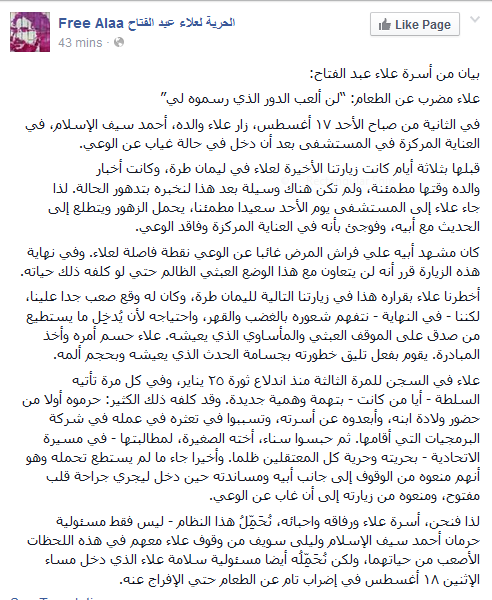 وأضاف بيان العائلة ان بعد استقرار حالة والده بالمستشفي، جاء علاء إلى المستشفى يوم الأحد سعيدًا مطمئنًا، يحمل الزهور ويتطلع إلى الحديث مع أبيه، وفوجئ بأنه في العناية المركزة وفاقد للوعي، الأمر الذي دفعه لإعلان إضرابه عن الطعام، خلال زيارة الأسرة التالية له في "ليمان طره"، وأضافت الأسرة أن السجن قد كلفه الكثير قائلاً: "حرموه أولاً من حضور ولادة ابنه، وأبعدوه عن أسرته، وتسببوا في تعثر عمله في شركة البرمجيات التي أقامها، ثم حبسوا سناء، أخته الصغيرة، لمطالبتها -في مسيرة الاتحادية- بحريته وحرية كل المعتقلين ظلمًا، وأخيرًا جاء ما لم يستطع تحمله، وهو أنهم منعوه من الوقوف إلى جانب أبيه ومساندته حين دخل ليجري جراحة قلب مفتوح، ومنعوه من زيارته إلى أن غاب عن الوعي. كما حملت الأسرة مسؤلية سلامة "علاء" ووالده إلي النظام، مطالبين بالإفراج الفوري عنه.