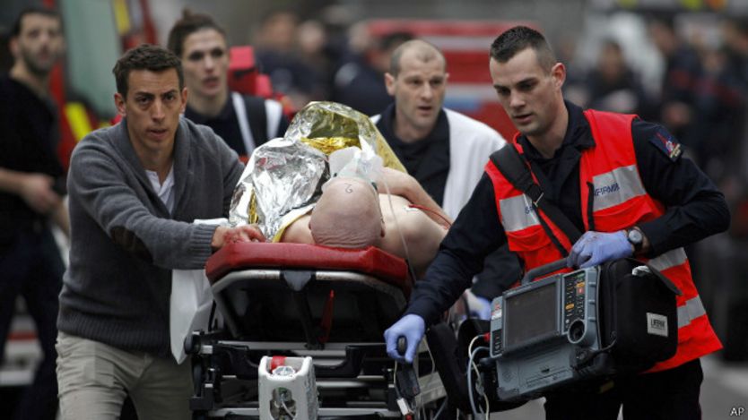 وأعلنت السلطات الفرنسية على الفور رفع حالة التأهب الأمني لأقصى درجاته في العاصمة باريس، موضحة أن عددا من المصابين في حال خطره، ووصف الرئيس الفرنسي فرنسوا هولاند الهجوم بأنه إرهابي، وأوضح شاهد عيان ان المهاجمين فتحا النيران عشوائيا من بندقيتين آليتين من طراز كلاشنيكوف.